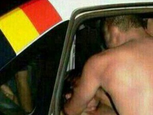 homem nu com a mulher apoiada no capô da viatura, enquanto outros dois, com as calças abaixadas, assistem à cena. Na segunda, a mulher está deitada no banco traseiro do carro com um deles por cima. Na última, ela está de costas e sobre o capô. O autor das fotos não foi identificado.